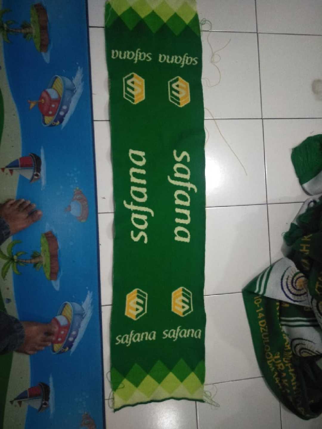 Pembuatan syal dengan cara manual kemudian di tambahkan bordir pada bagian logo nya.